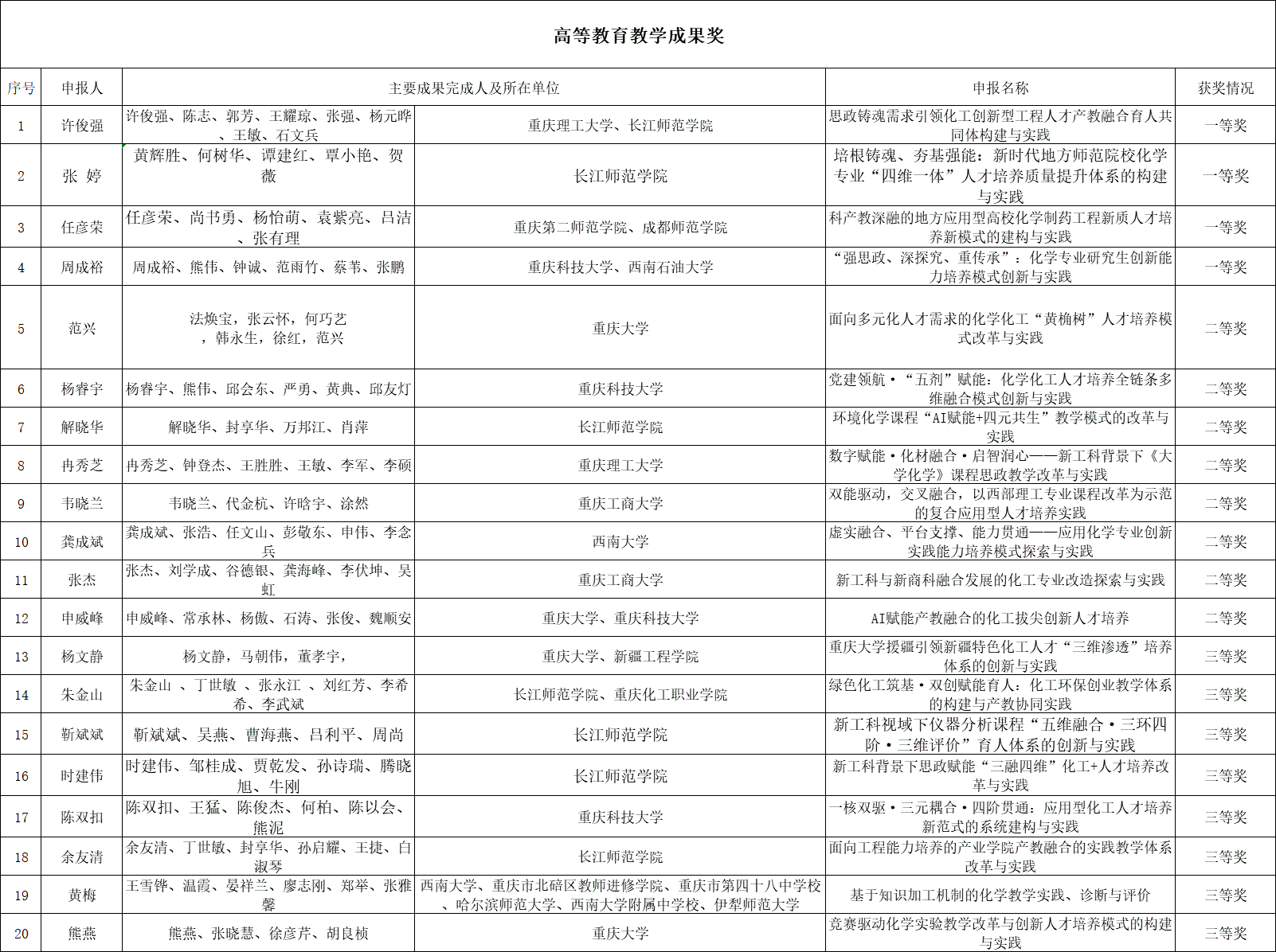 为深入实施创新驱动发展战略,鼓励科技创新,展示我市化学化工高等教育领域在科学技术、教学改革、团队建设和人才培养方面取得的卓越成就,重庆市化学化工学会组织开展了2024年度科学技术奖、高等教育教学奖的评审工作。本次评审遵循《重庆市化学化工学会科学技术奖管理办法》、《重庆市化学化工学会高等教育教学奖认定办法》的相关规定,坚持公平、公正、公开的原则,经过单位申报、形式审查、专家评审委员会评审等环节,现已完成评审工作。