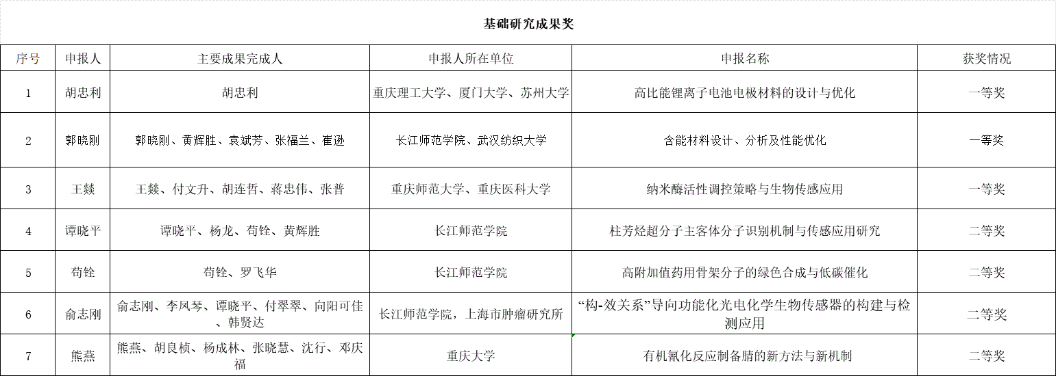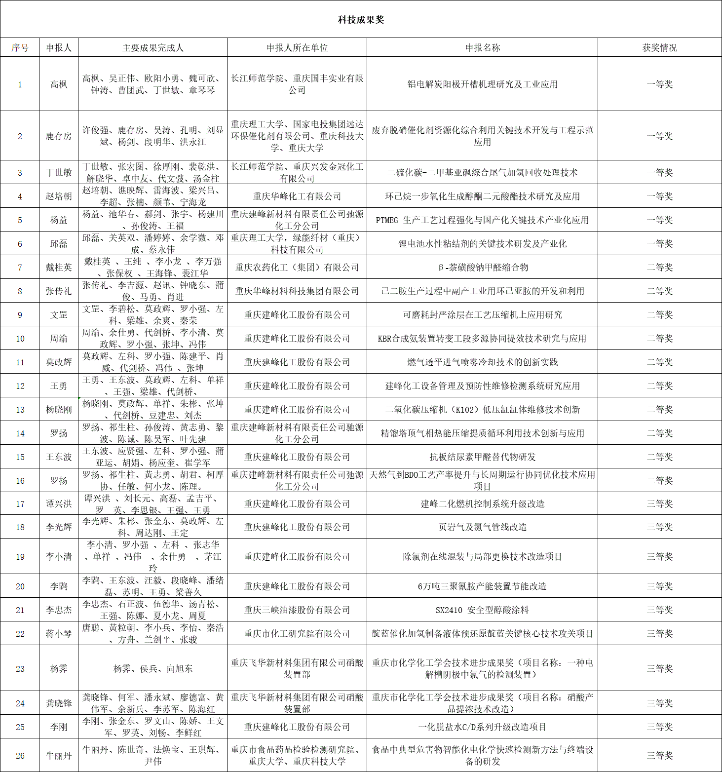为深入实施创新驱动发展战略,鼓励科技创新,展示我市化学化工高等教育领域在科学技术、教学改革、团队建设和人才培养方面取得的卓越成就,重庆市化学化工学会组织开展了2024年度科学技术奖、高等教育教学奖的评审工作。本次评审遵循《重庆市化学化工学会科学技术奖管理办法》、《重庆市化学化工学会高等教育教学奖认定办法》的相关规定,坚持公平、公正、公开的原则,经过单位申报、形式审查、专家评审委员会评审等环节,现已完成评审工作。